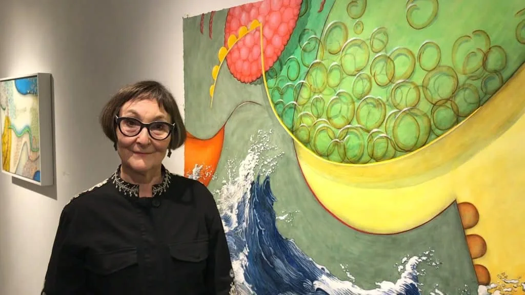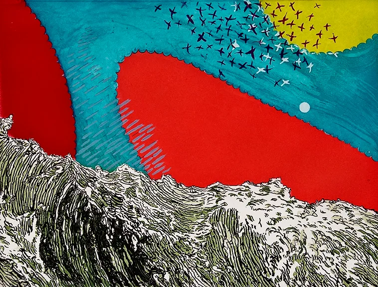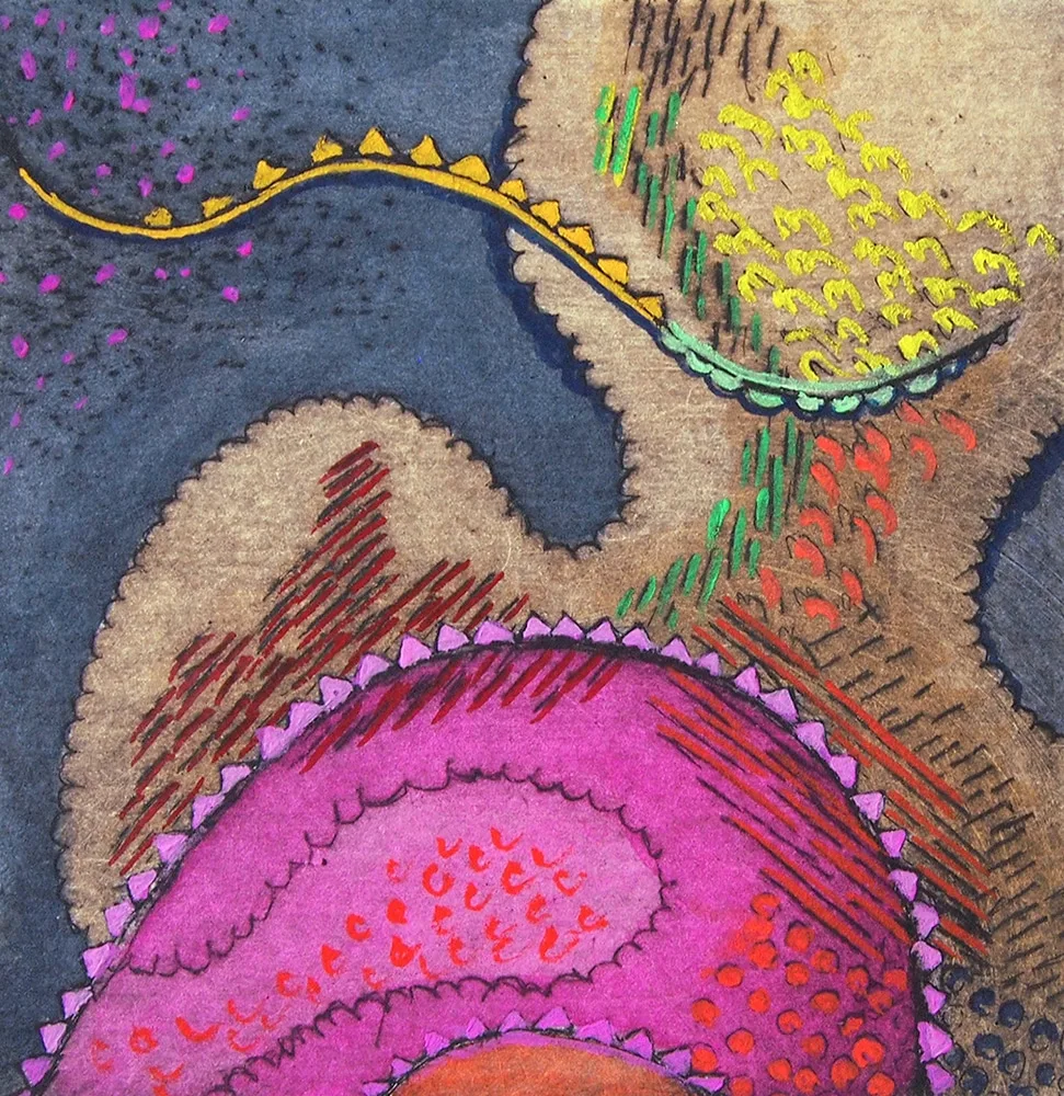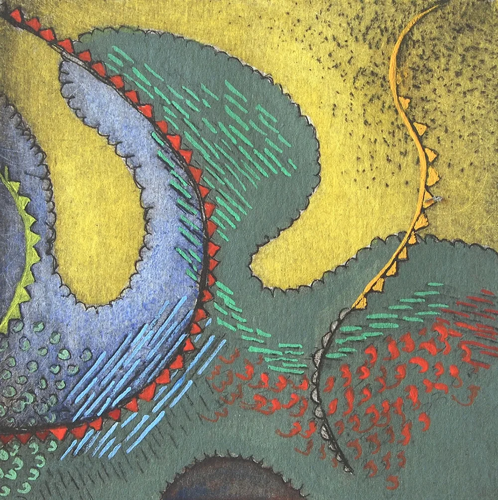 Like a human life, my artwork is multi-layered, complex, and develops over time. Color, texture, humor, and the physical joy of applying paint and cutting relief prints are important in the creation of my work. In the process of creating a piece, I begin working on an idea with a loosely drawn skeleton. I add layers of paint and drawing, building up layers of meanings and emphasis to create a finished piece that is dense with meaning.