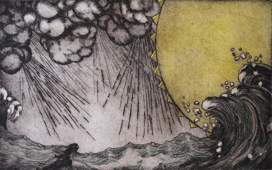 My current artwork uses the lines and patterns from daily weather maps and images of weather — rain, snow, clouds, hail — as visual metaphors for these ideas. It explores the constancy, variation, and violence hidden within the familiar, reassuring seasonal cycle. I also use images of oceans — stormy, placid, or dramatic — as visual reflections of human moods and emotions.